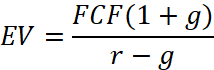 Under these assumptions, free cash flow (FCF) also grows at rate g, allowing us to use the classic perpetual growth model: