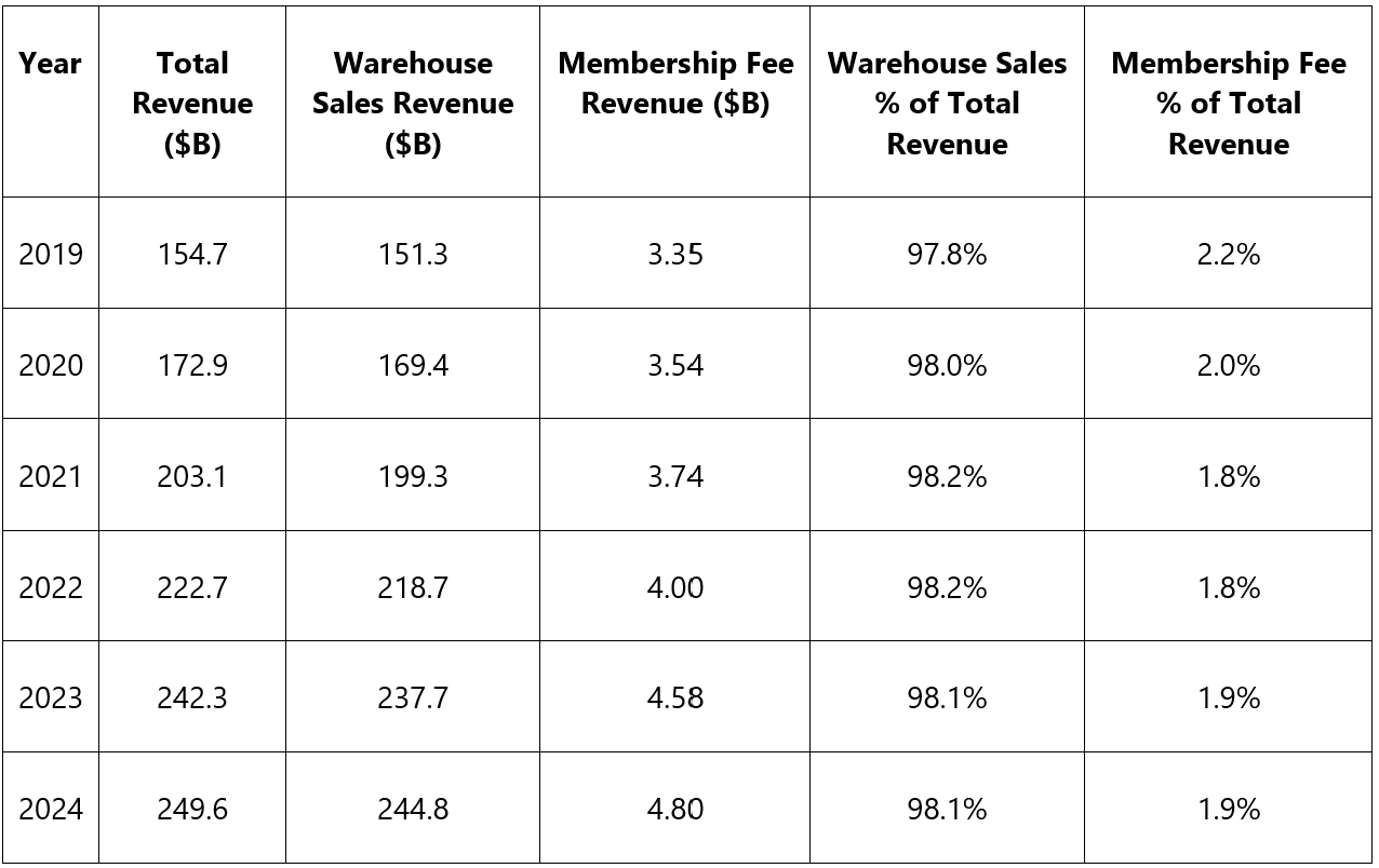 Between 2019 and 2024, both Costco’s warehouse sales and membership fee revenue grew steadily. As Table 1 shows, roughly 98% of revenue comes from merchandise sales, with membership fees contributing just under 2%.