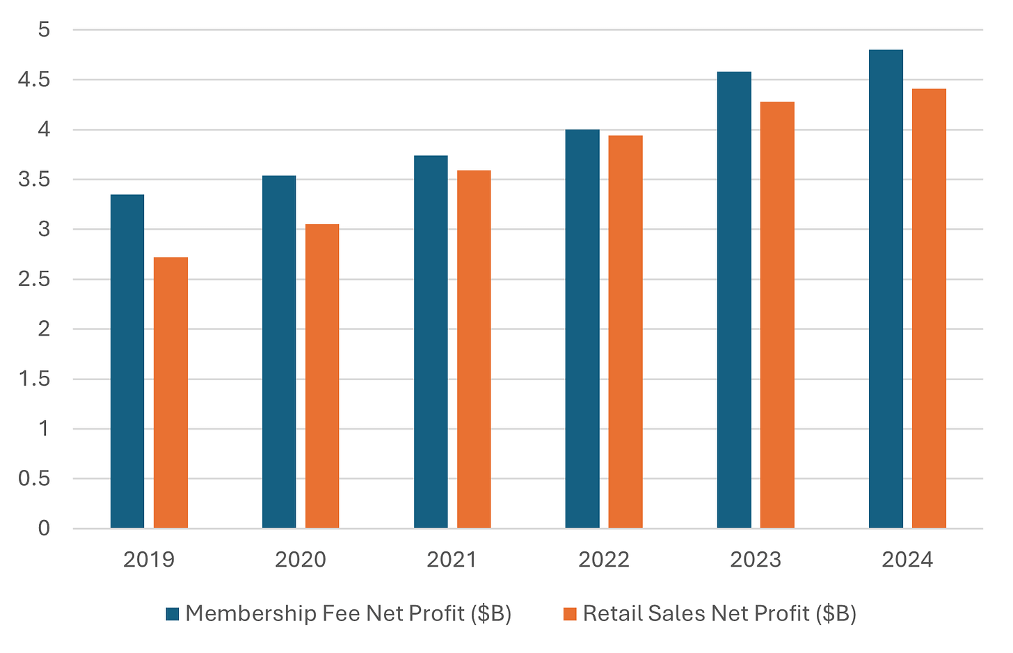 Figure 1. Net Profit from Membership Fees vs. Retail Sales, 2019–2024