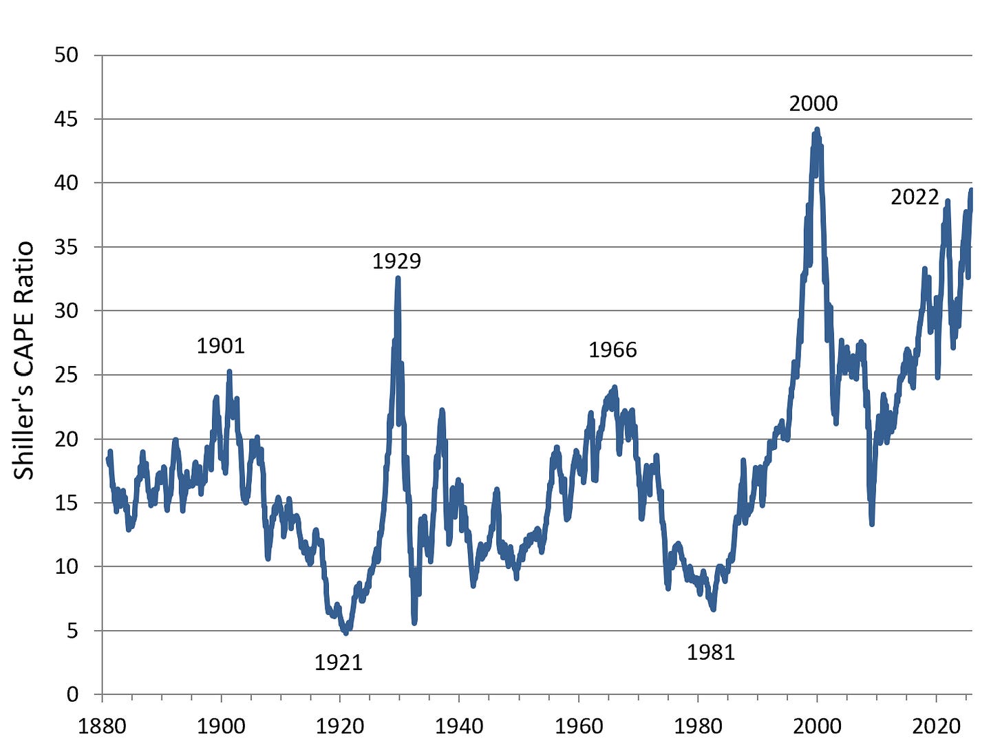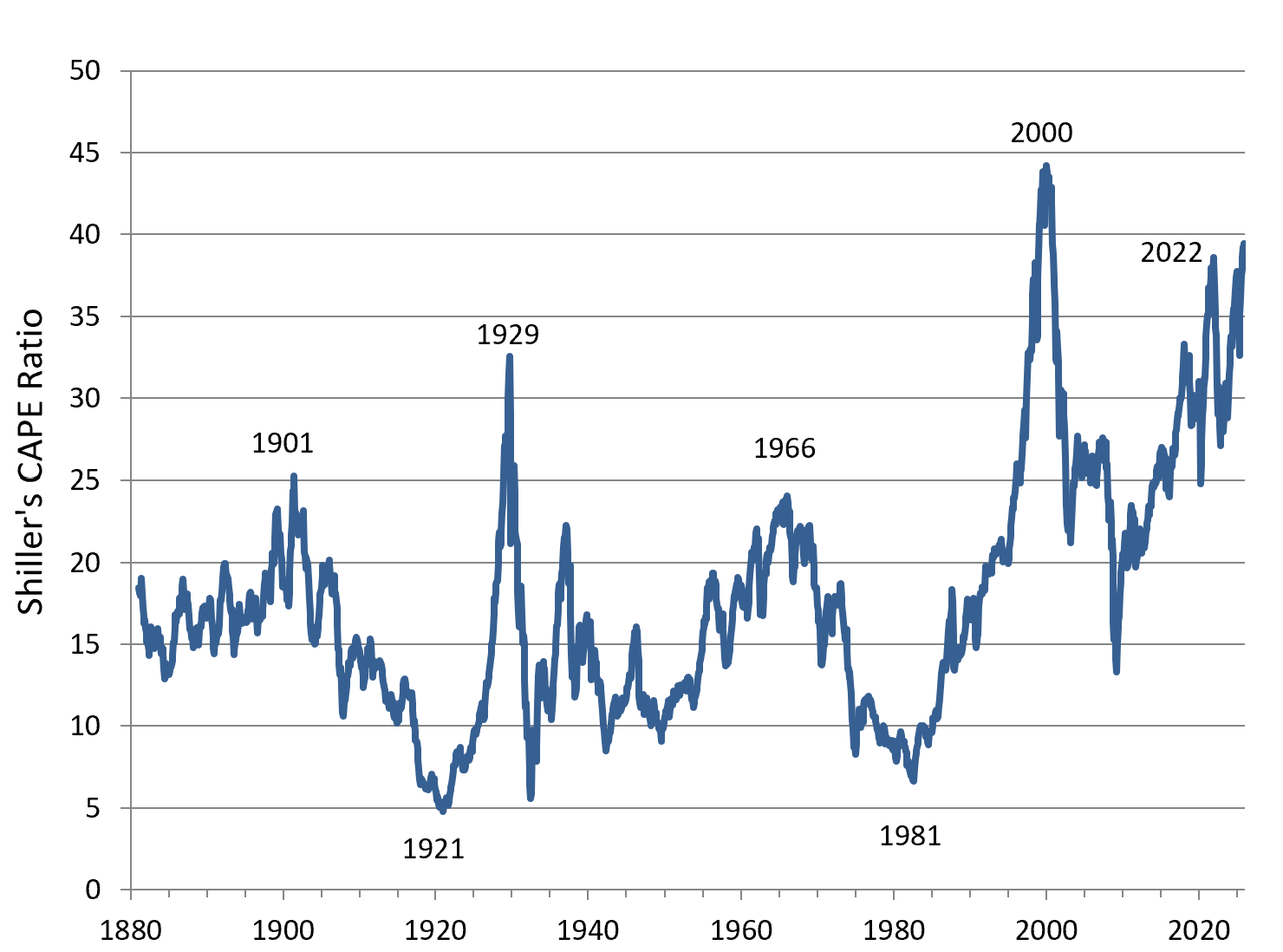 To put today’s market in context, Figure 1 shows that the current CAPE ratio of about 40—Shiller’s cyclically adjusted price-to-earnings ratio, which smooths earnings over the business cycle—has only been matched once in the last century and a half. And that occurred during the height of the dot-com bubble.