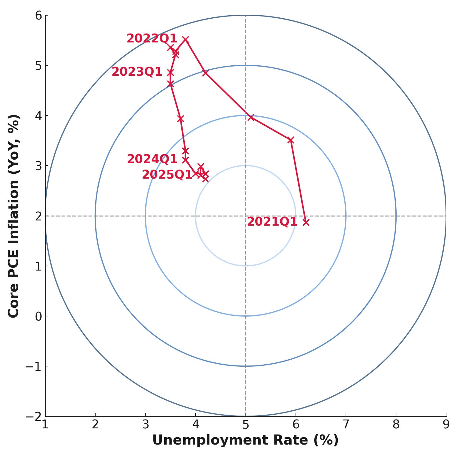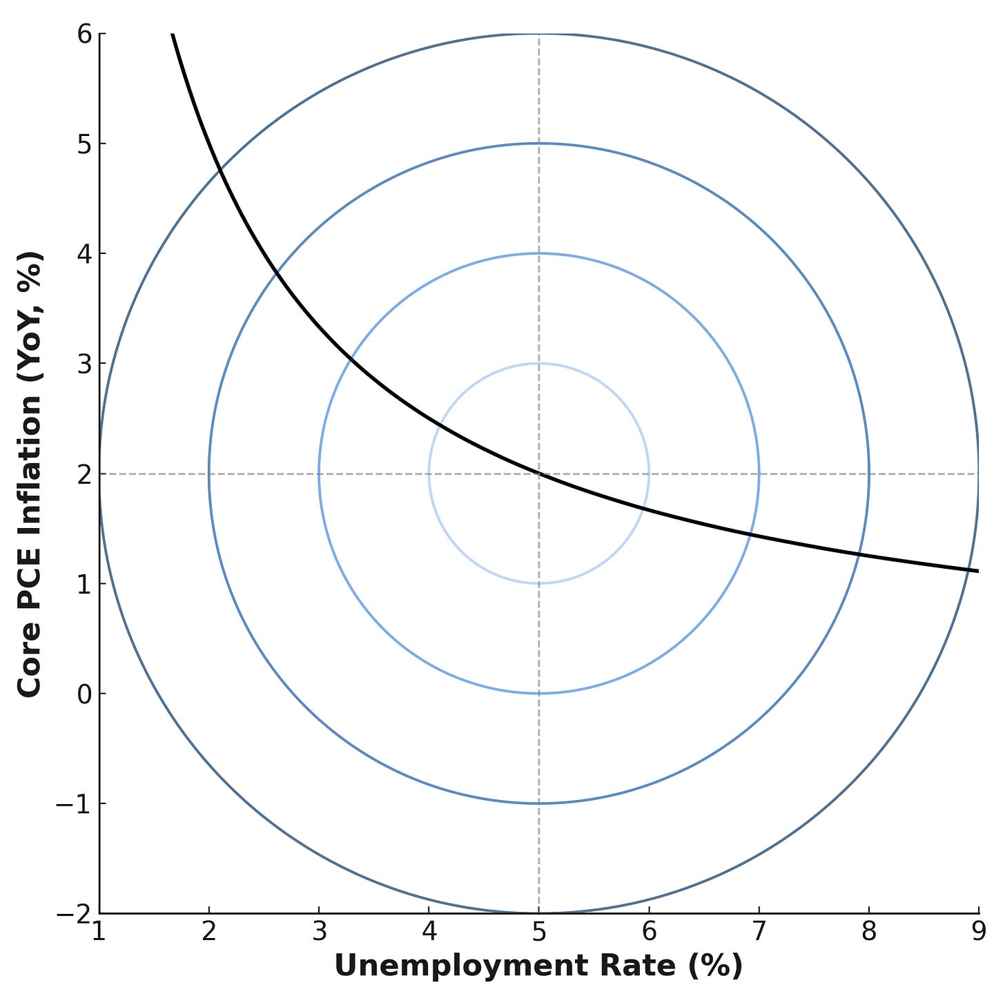Thinking about policy through this lens makes it easier to interpret where we stand. When inflation and unemployment both sit near their targets, the economy is effectively at the bullseye in the diagram. Deviations in either direction signal that policy may be too loose or too tight. The value of this framework is that it lets us judge policy not by unreliable estimates of r-star, but by outcomes we can actually observe in the data.