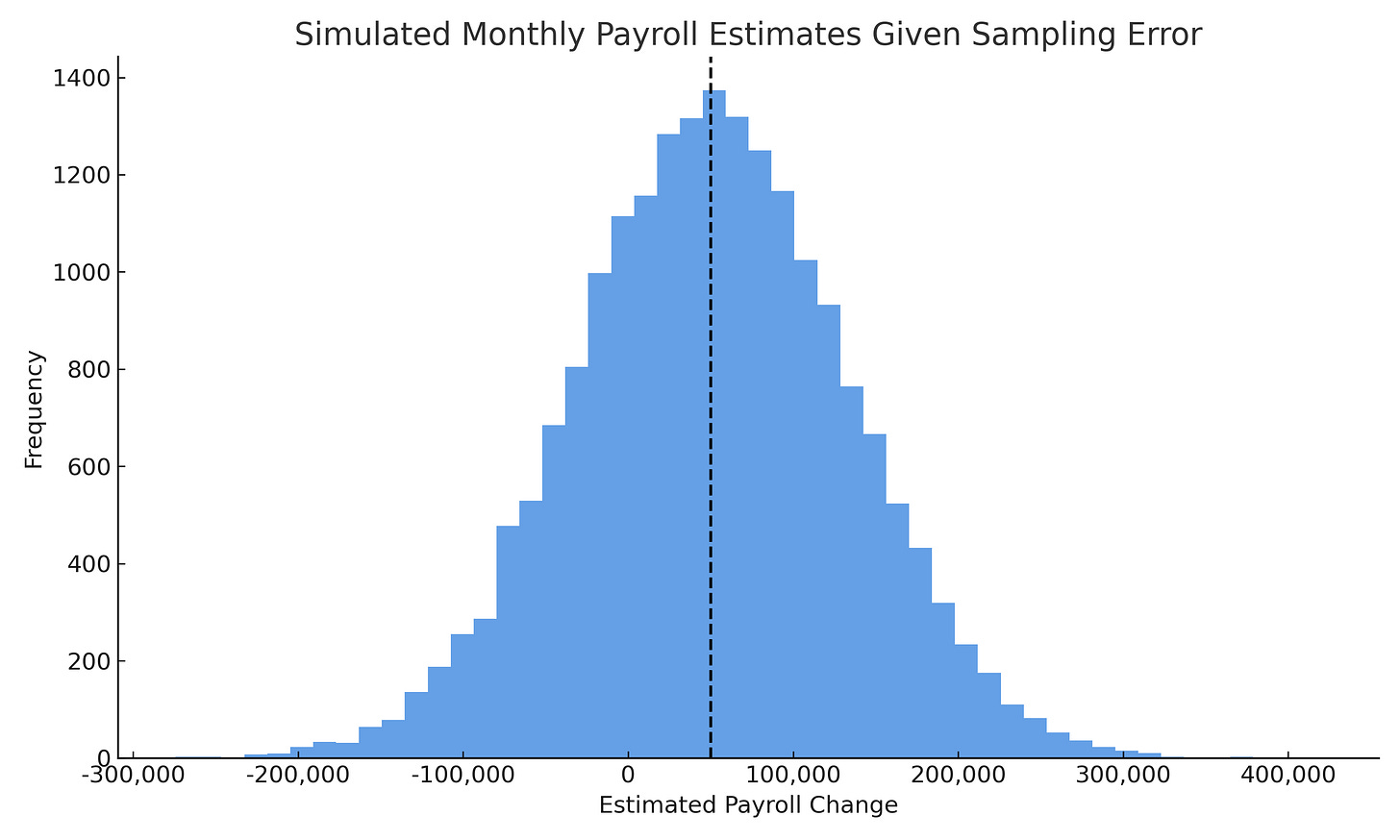 To see this more clearly, imagine the economy actually added a modest +50,000 jobs last month. Given the sampling error, repeated BLS-sized samples of the actual economy can plausibly produce reported changes in monthly nonfarm payrolls that range from strongly negative to strongly positive, purely because of statistical noise (Figure 1).
