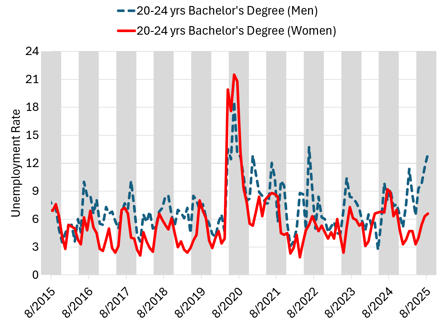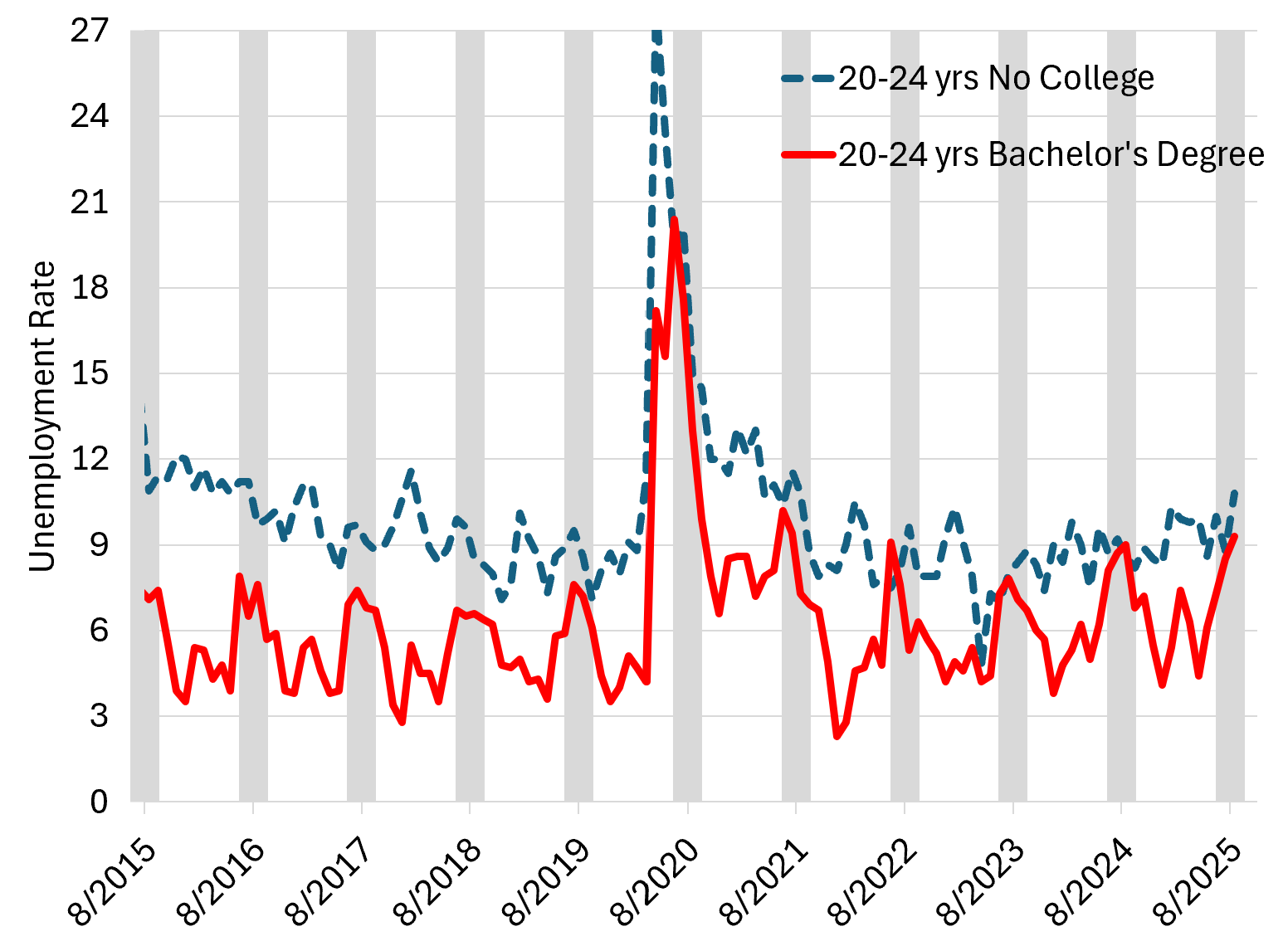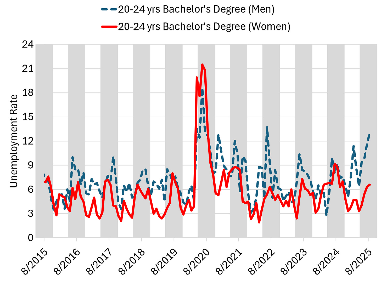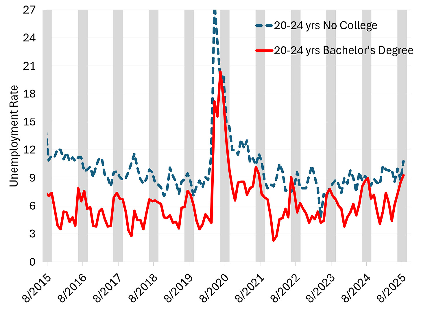 This seasonal pattern is so strong that the unemployment rate for recent college graduates sometimes rises above that of similarly aged workers without a college education, albeit briefly. This reversal happened during the summers of 2022, 2023, 2024, and it came close to happening again this past summer. But come fall, the unemployment rate for recent college graduates tends to settle back below that of their less educated peers.