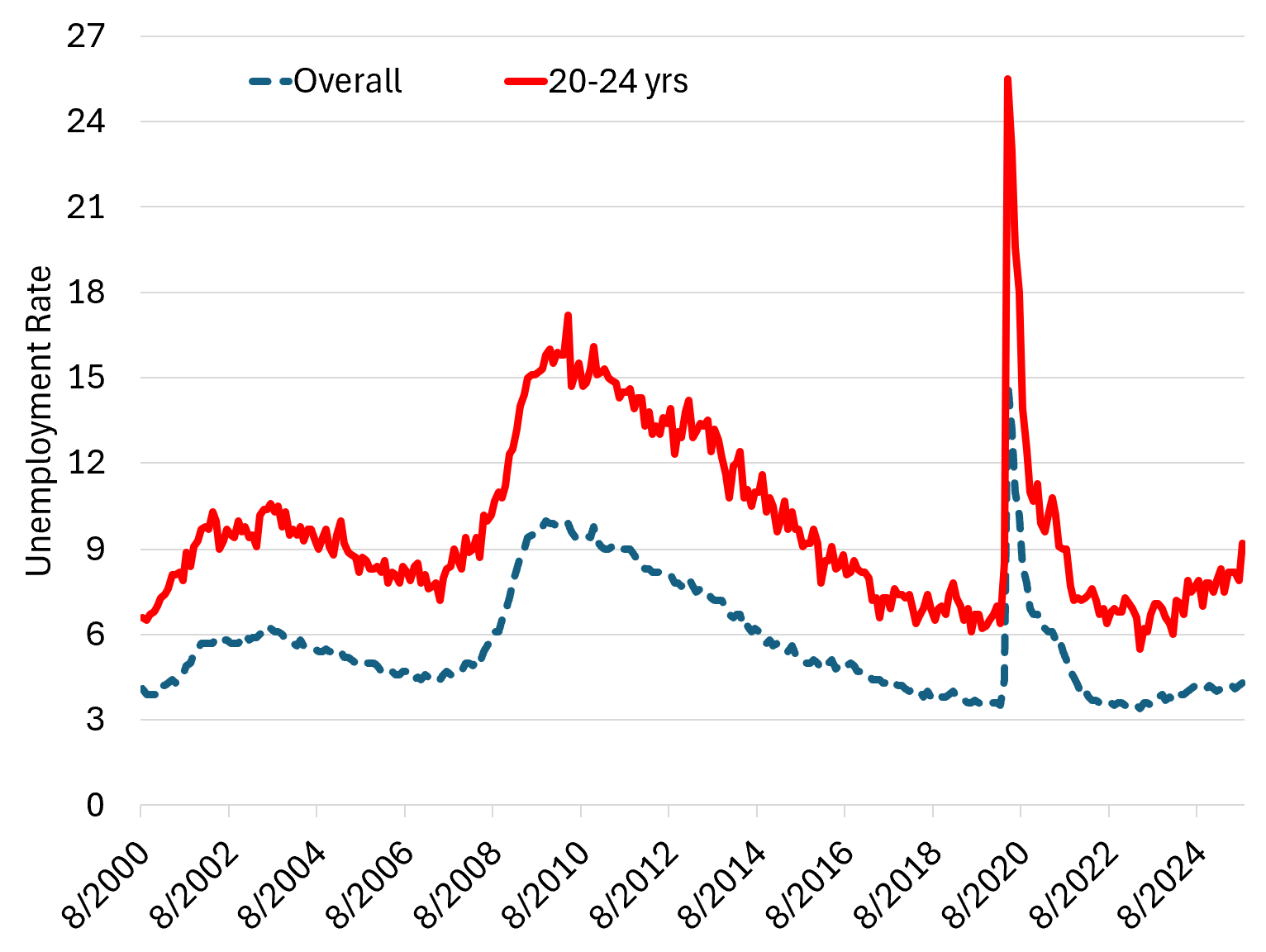 Young workers have had a higher unemployment rate in every cycle, from the dot-com bust to the post-COVID expansion. This reflects normal labor market churn: young people are typically entering the workforce for the first time and switch jobs frequently, both of which tend to raise their unemployment rate relative to older, more established workers.