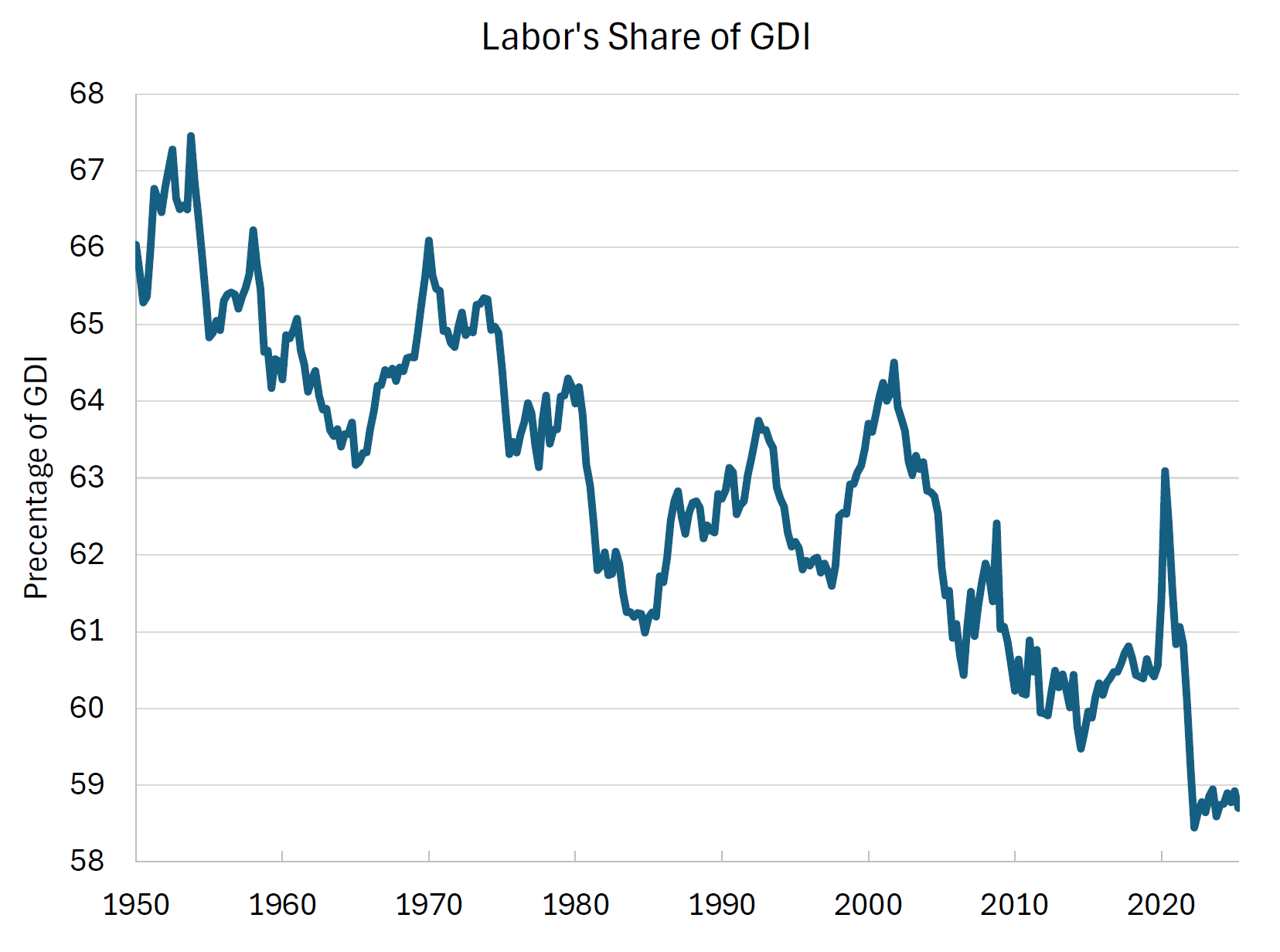 Since 1950, labor’s share of Gross Domestic Income (GDI) has declined steadily, falling from about 66 percent to 58 percent today, a drop of 8 percentage points.