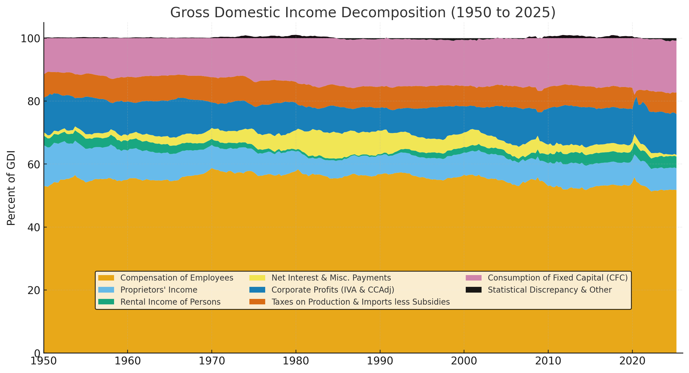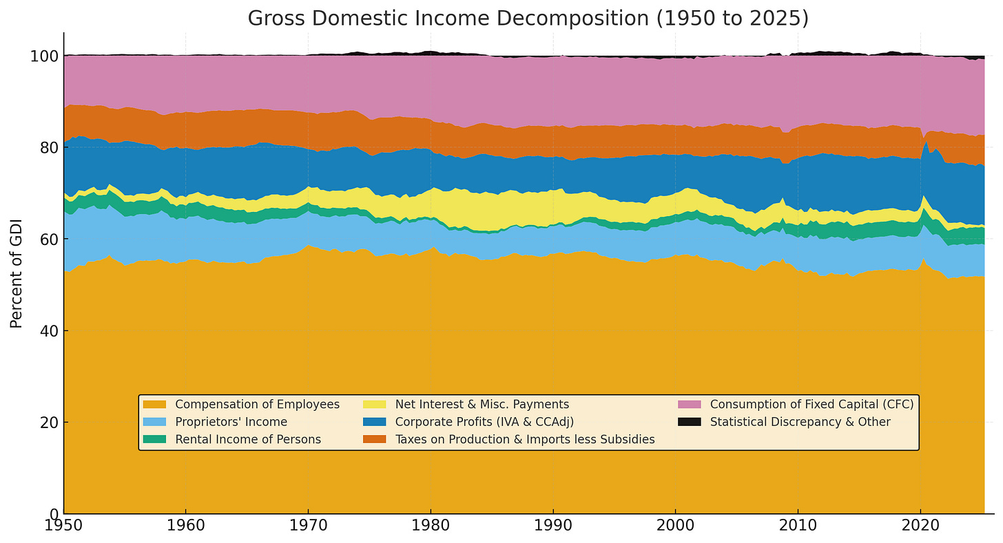 When we break GDI into its components—labor compensation, proprietors’ income, corporate profits, interest, taxes, and consumption of fixed capital—we find that corporate profits have indeed risen, but only modestly. Their share of total income has increased from about 10 percent in the 1950s to roughly 13 percent today, capturing just 3 of the 8 percentage points lost by labor.2