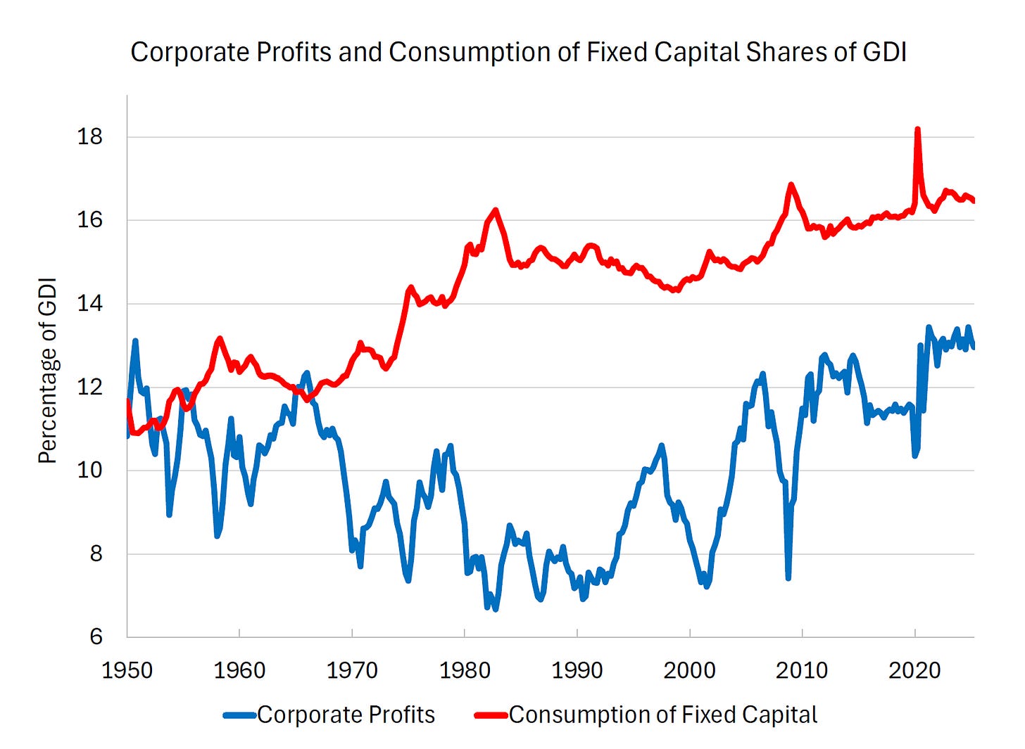 The answer lies in consumption of fixed capital, what economists call depreciation. Depreciation’s share of GDI climbed from roughly 11 percent in the 1950s to about 16 percent today, accounting for the remaining 5 percentage points of labor’s loss.