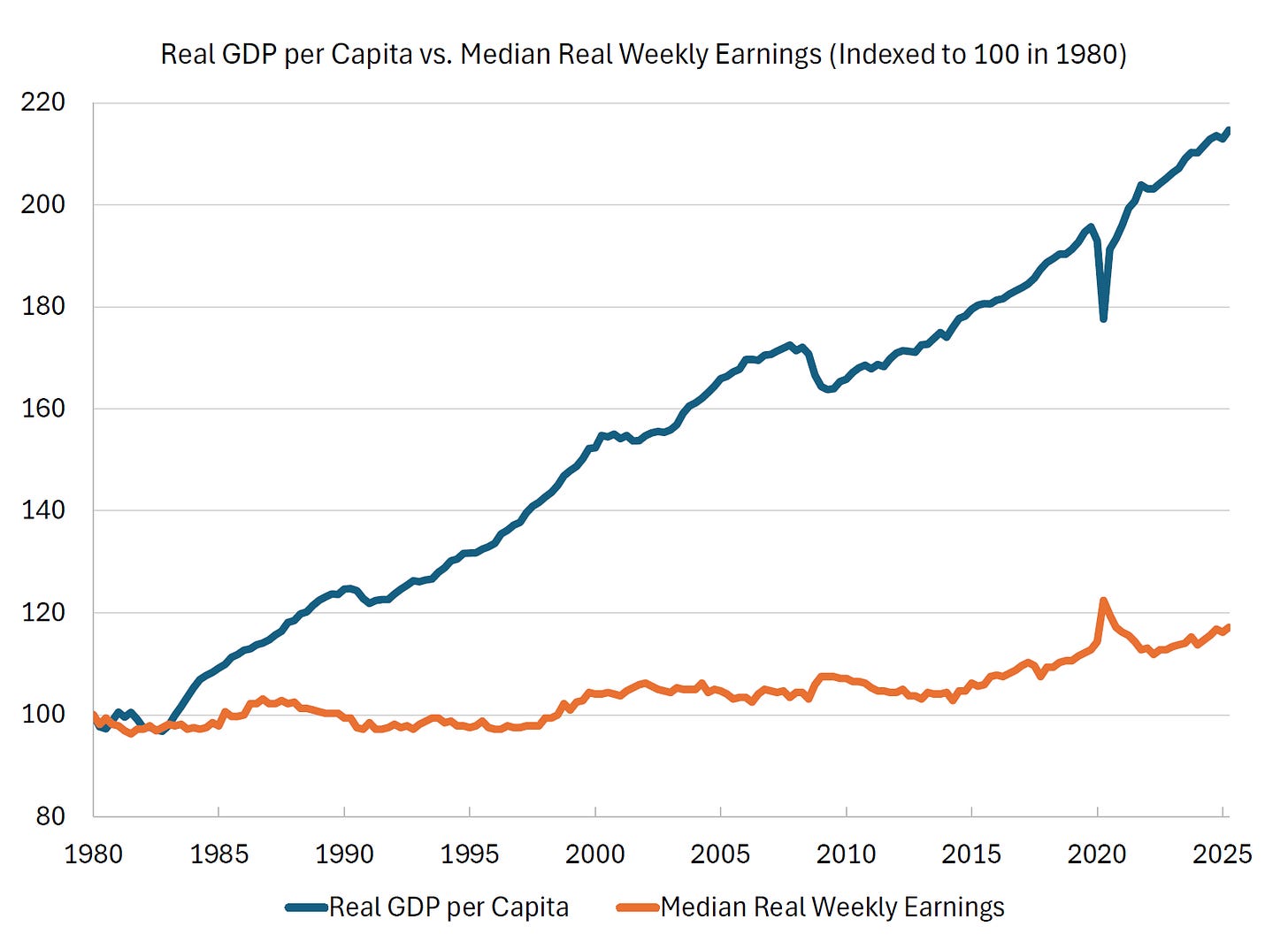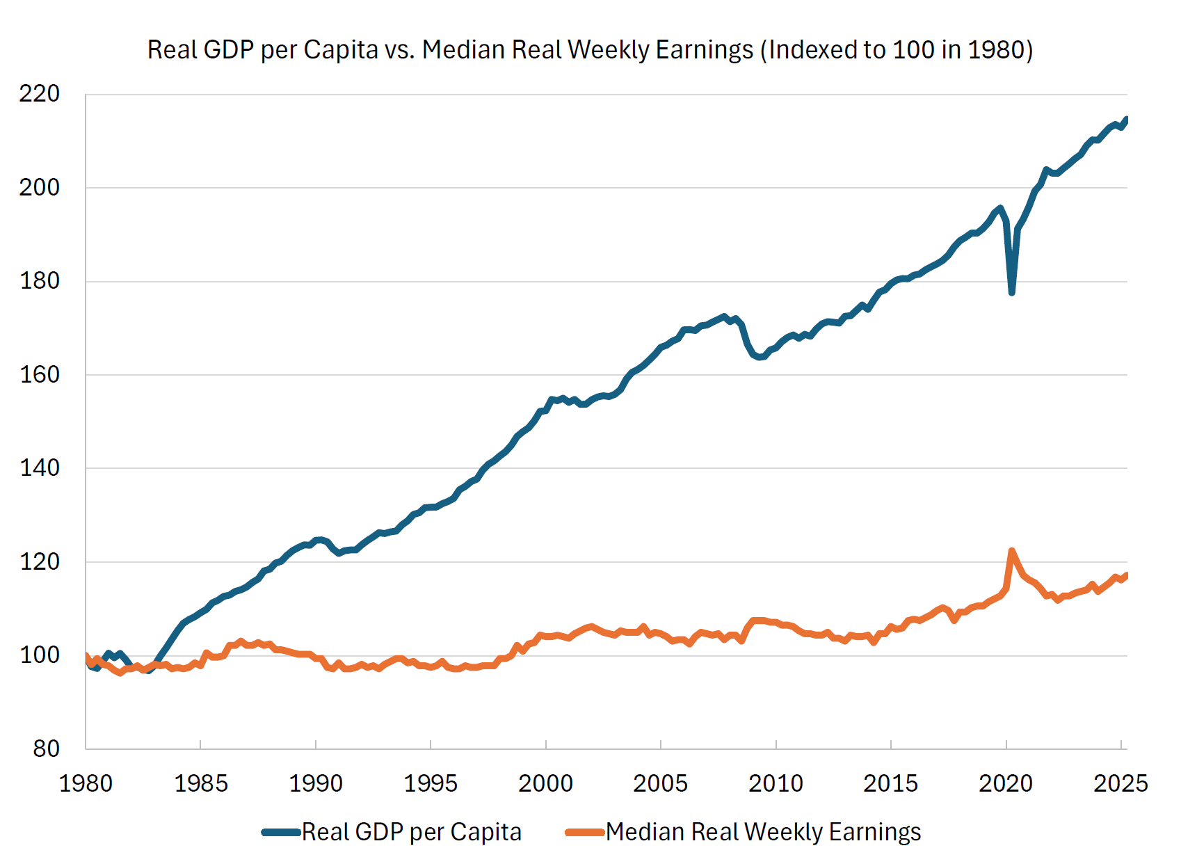 There is perhaps no clearer way to see this divergence than to compare growth in real GDP per capita with growth in real labor income. Between 1980 and 2025, real GDP per capita more than doubled, while median real weekly earnings for workers aged 16 and over barely increased. This growing gap between output and earnings mirrors the long-run decline in labor’s share.